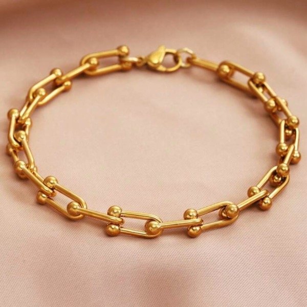 Pulsera con eslabones grilletes con esferas, de acero quirúrgico 316L con baño en oro 18 K, inalterable e inoxidable.