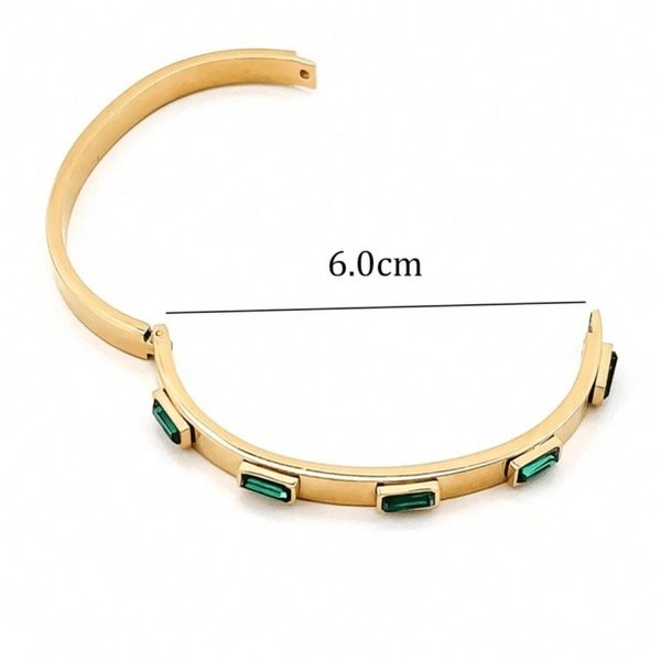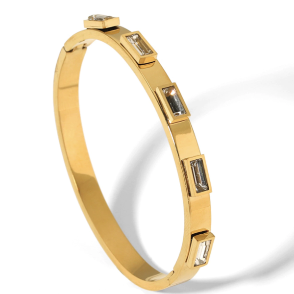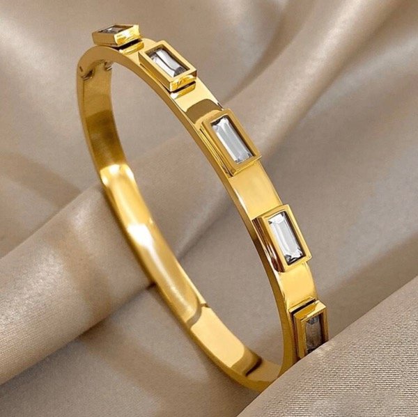 Pulsera esclava de acero quirúrgico con baño en oro. Posee zirconias cúbicas.
