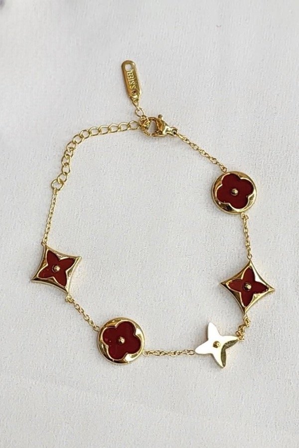 Pulsera de acero inoxidable con dijes en forma de trébol de cuatro hojas, algunos redondos y otros cuadrados, con un acabado esmaltado.