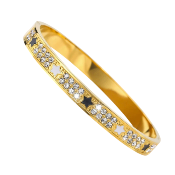 Pulsera esclava de acero quirúrgico con baño en oro. Con piedras de zirconias geométricas.