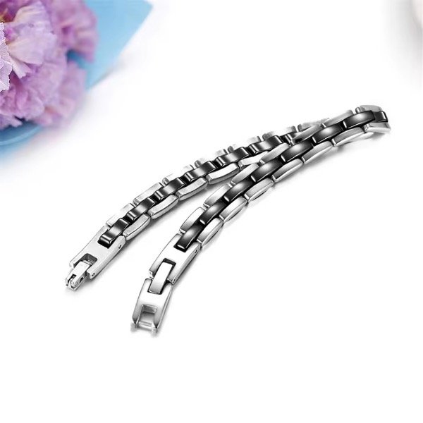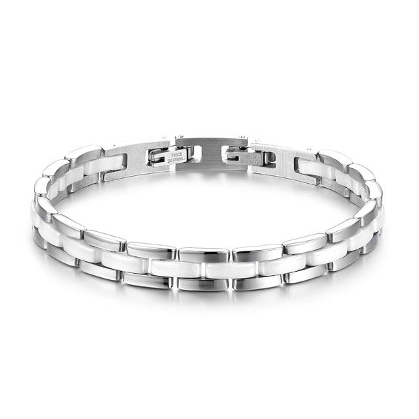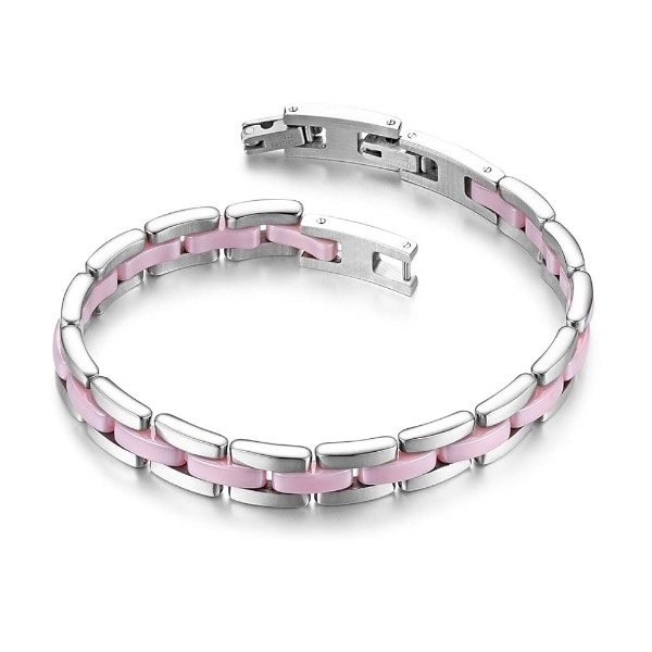 Pulsera de eslabones de acero inoxidable y cerámica rosa.