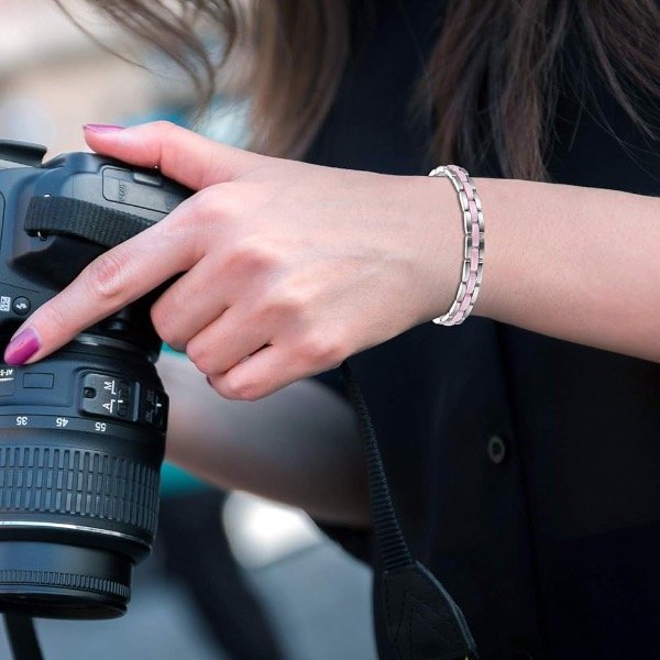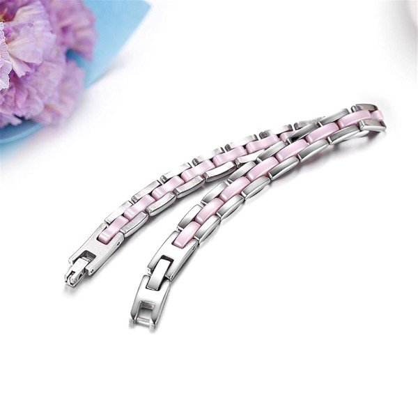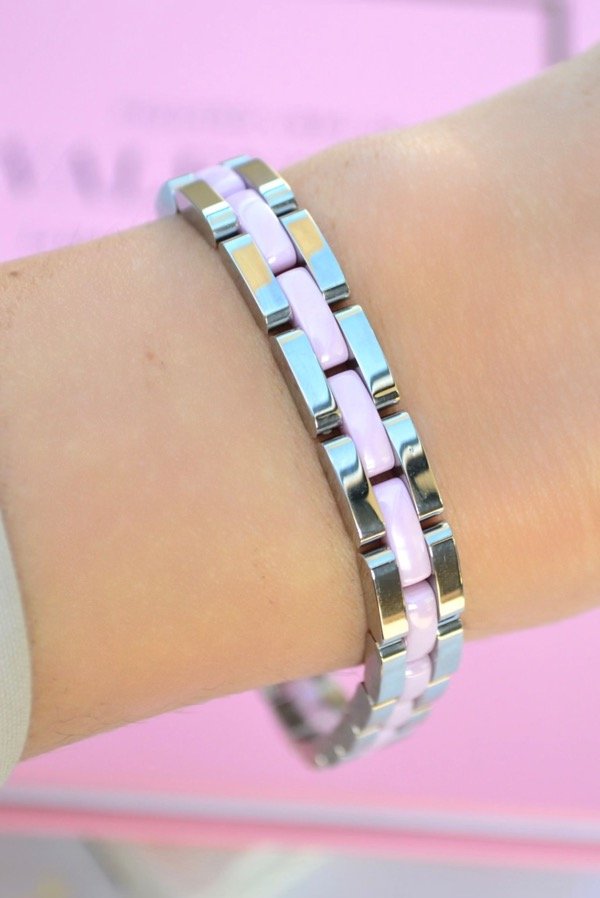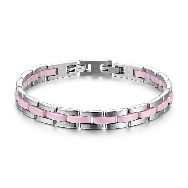 Pulsera de eslabones de acero inoxidable y cerámica rosa.