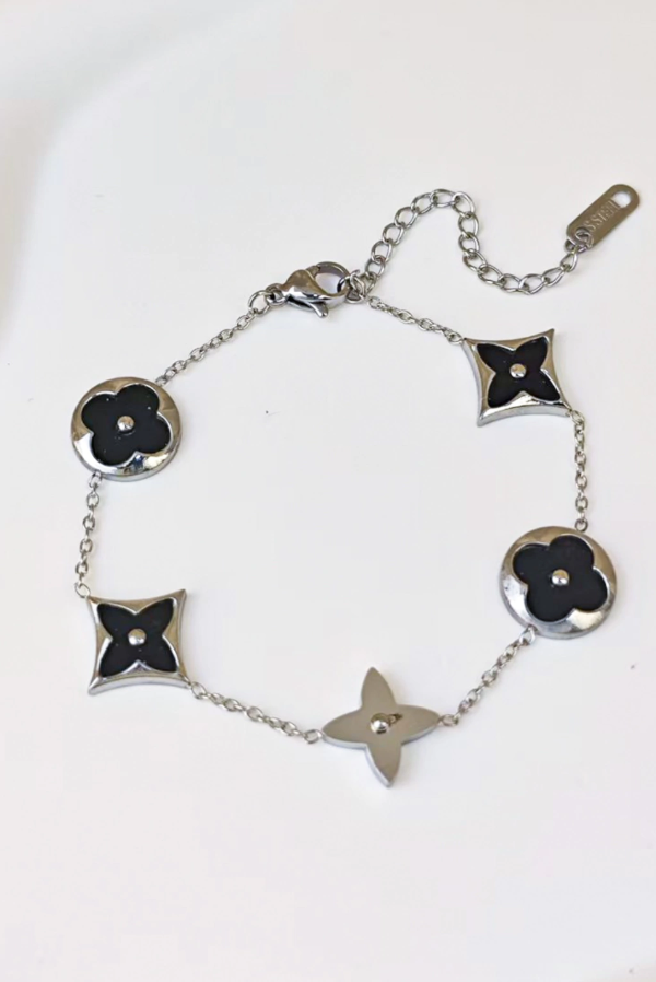 Pulsera de acero inoxidable con dijes en forma de trébol de cuatro hojas, algunos redondos y otros cuadrados, con un acabado esmaltado.