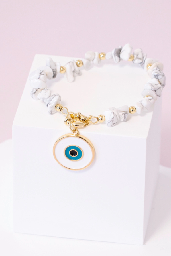 Esta es una pulsera de ojo turco, un amuleto que se cree que protege contra la envidia y las malas energías. Tiene piedras blancas intercaladas con cuentas doradas brillantes.